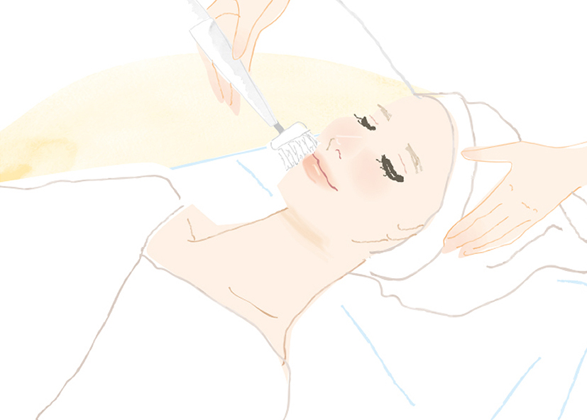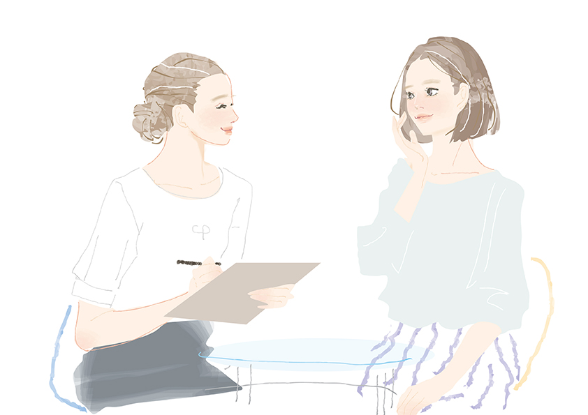 季節や環境による肌のお悩み、普段のお手入れ方法など、肌の状態を確認します。肌のお悩みなどもお気軽にご相談ください。フェイシャルエステティックに使用するスキンケアアイテムをお選びします。